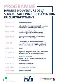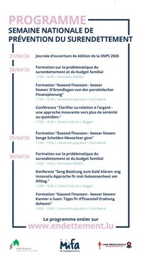 La journée d’ouverture, organisée le lundi 27 avril 2026 à l’Abbaye Neumünster, proposera une séance académique réunissant des acteurs institutionnels, des experts et des professionnels engagés dans la prévention du surendettement et l’éducation financière. Cette matinée sera rythmée par des interventions portant notamment sur les réalités luxembourgeoises en matière de dettes, les comportements à risque, l’impact de la digitalisation sur la gestion de l’argent ou encore la relation personnelle à l’argent.