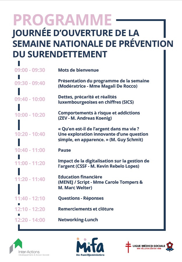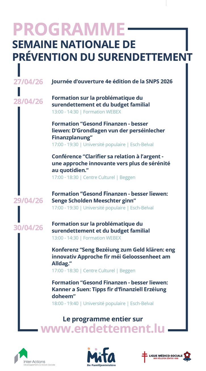Nous avons le plaisir de vous inviter à la 4e édition de la Semaine Nationale de Prévention du Surendettement (SNPS), organisé en partenariat avec le ministère de la Famille, des Solidarités, du Vivre ensemble et de l’Accueil et Inter-Actions asbl du 27 avril au 1er mai 2026.